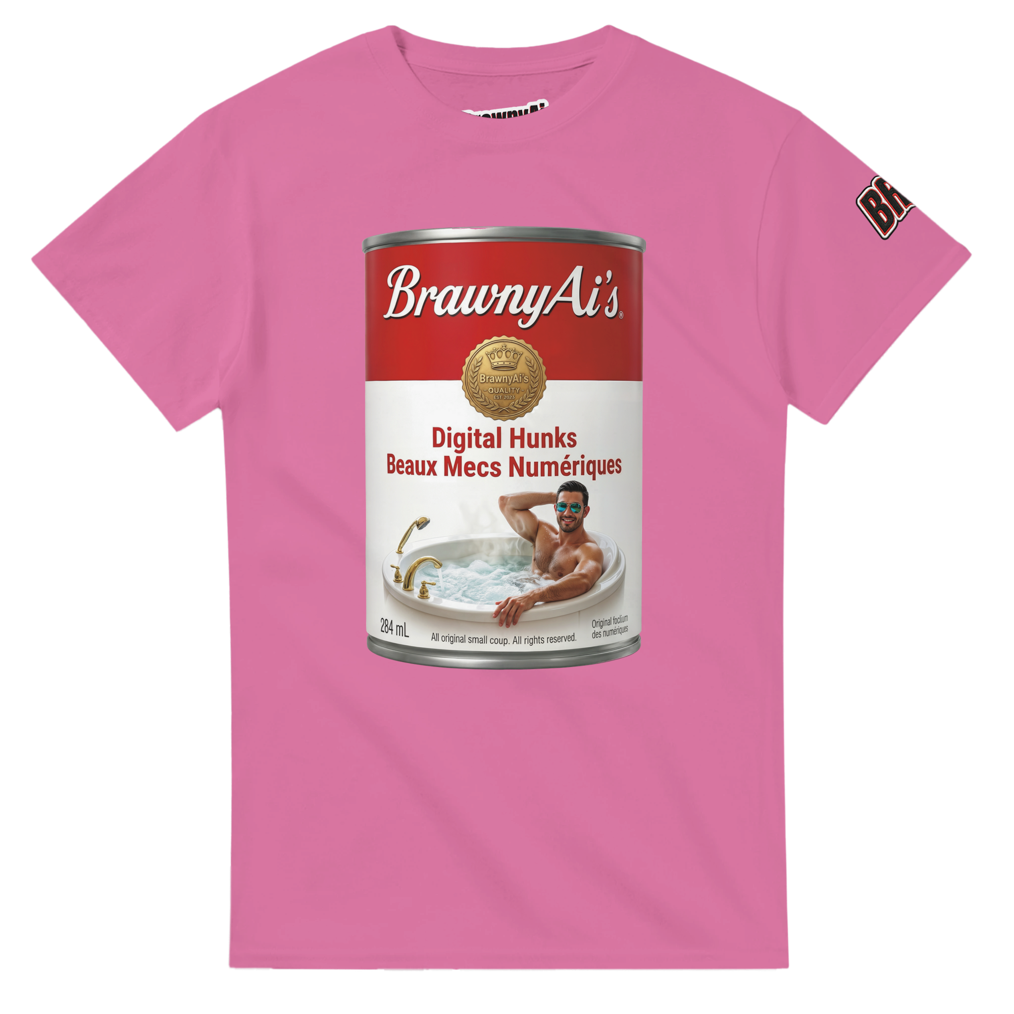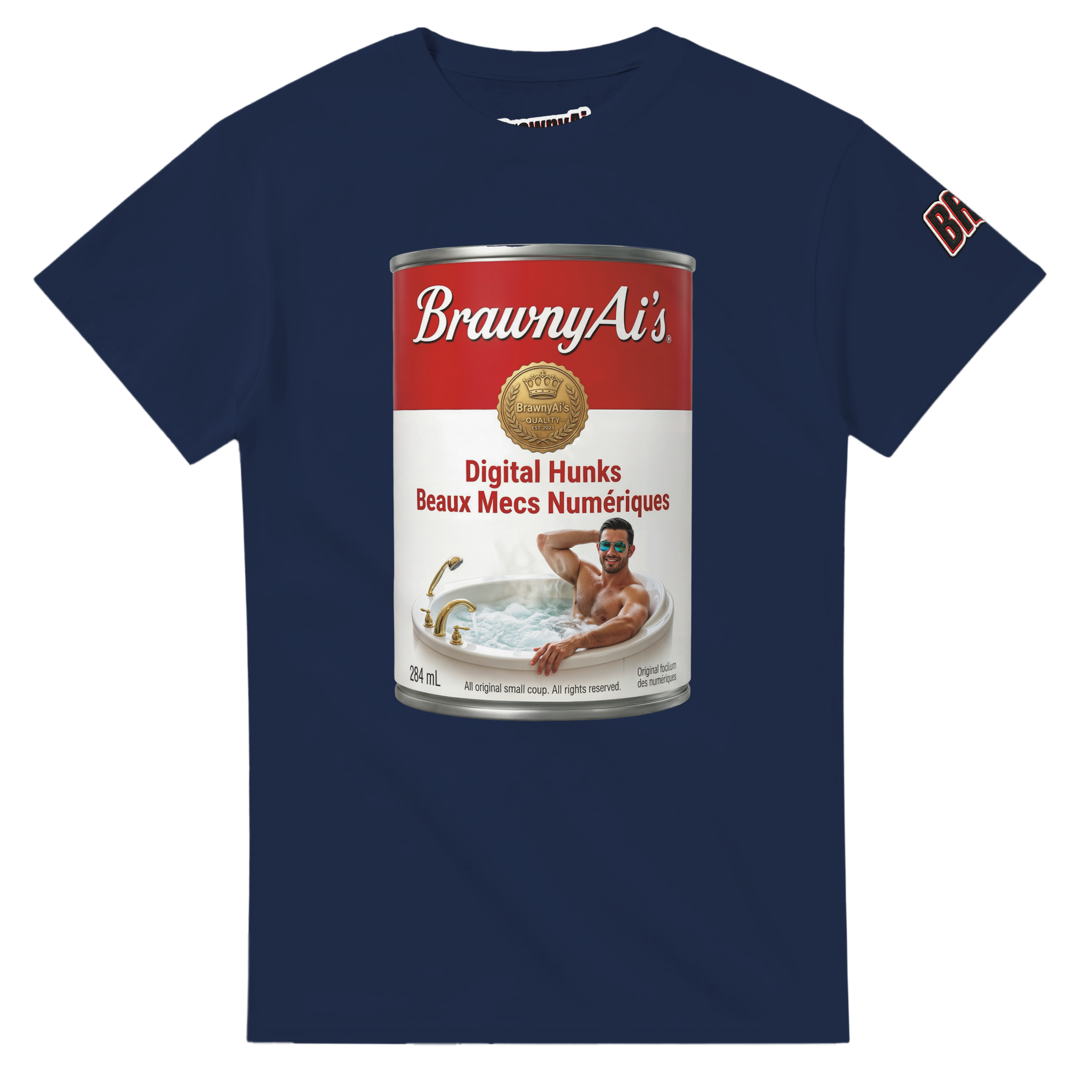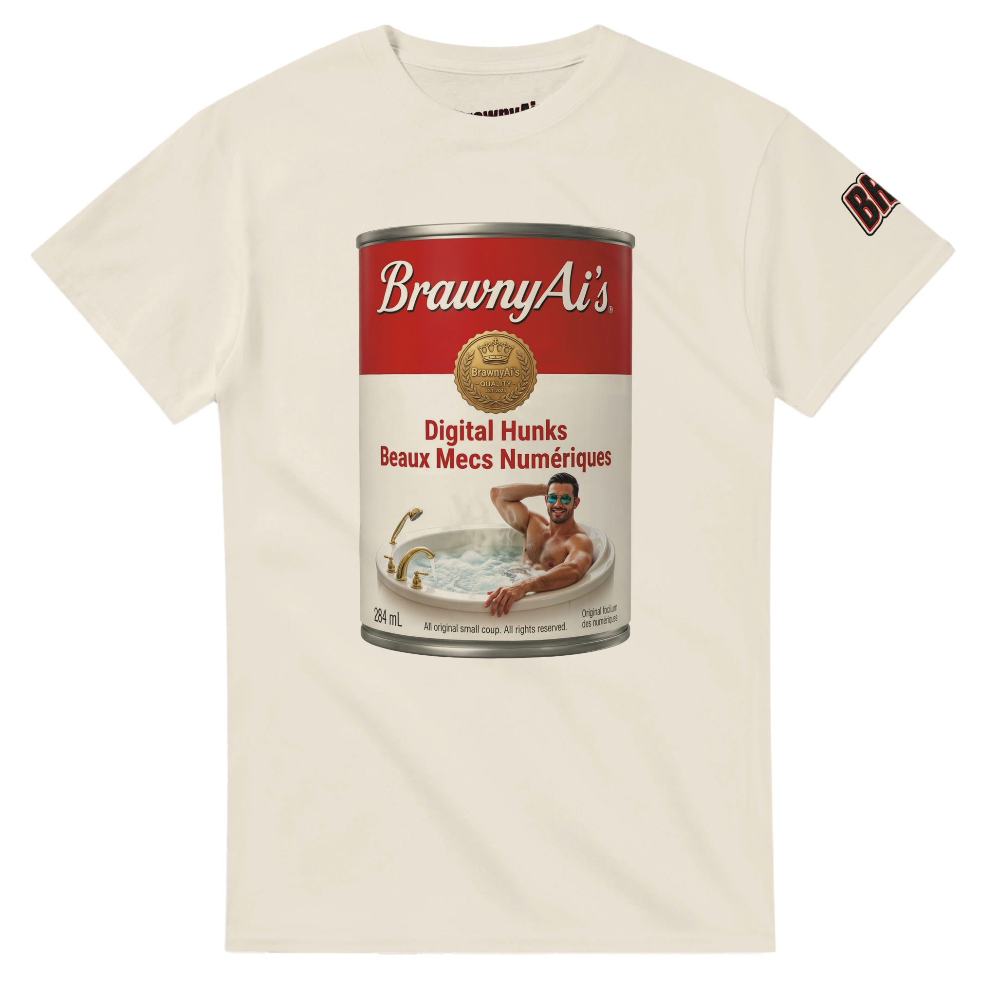 Serve it up hot. Step into the B-side with an instant pop-art classic. Featuring our signature “Digital Hunks” soup can—complete with a piping hot tub and a bilingual nod of Beaux Mecs Numériques—this tee is a daily serving of unapologetic BrawnyAi humor.
