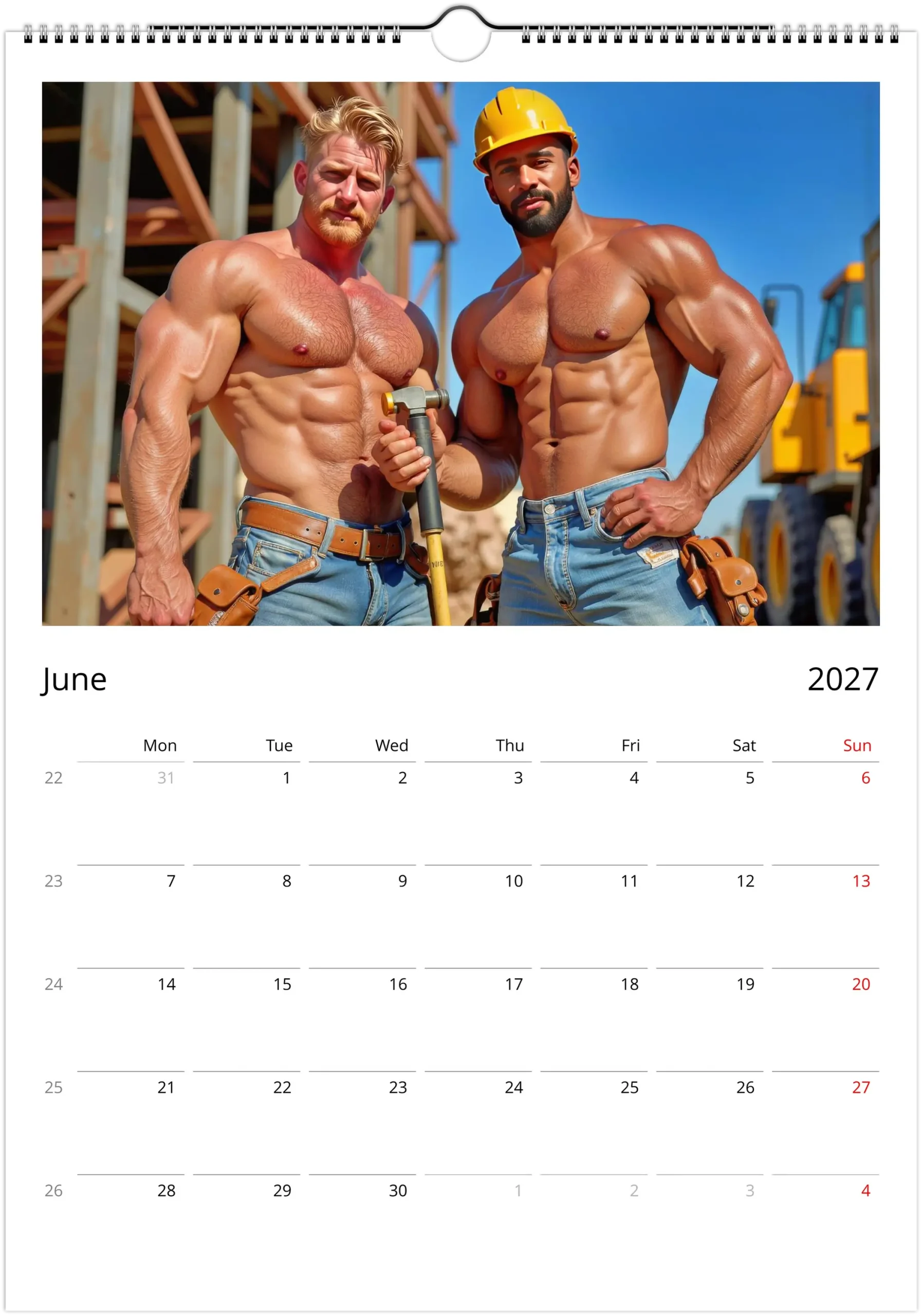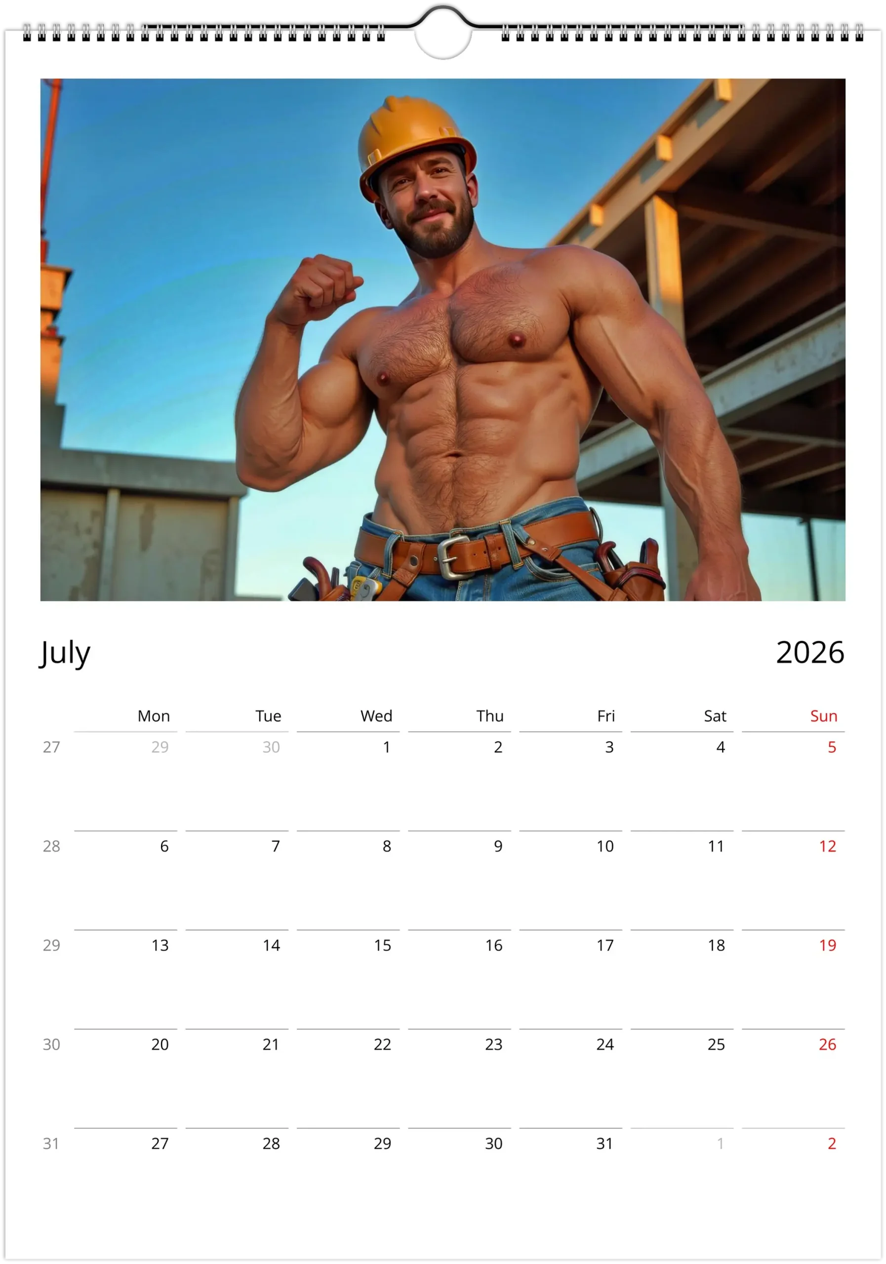 This Mid-2026 edition starts in July 2026 and features a full lineup of rugged, photoreal hunky construction workers in hard hats, denim, boots, and sun-soaked jobsite scenes. It is part pin-up, part visual tribute to the workers who shaped the modern image of strength, grit, and practicality.