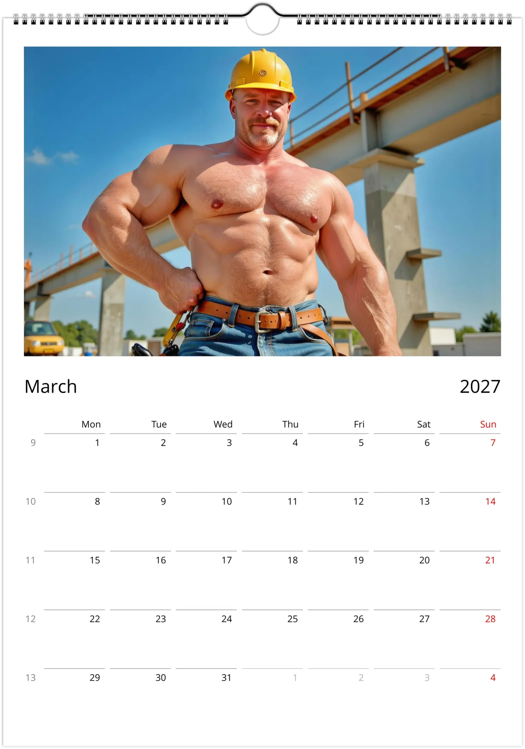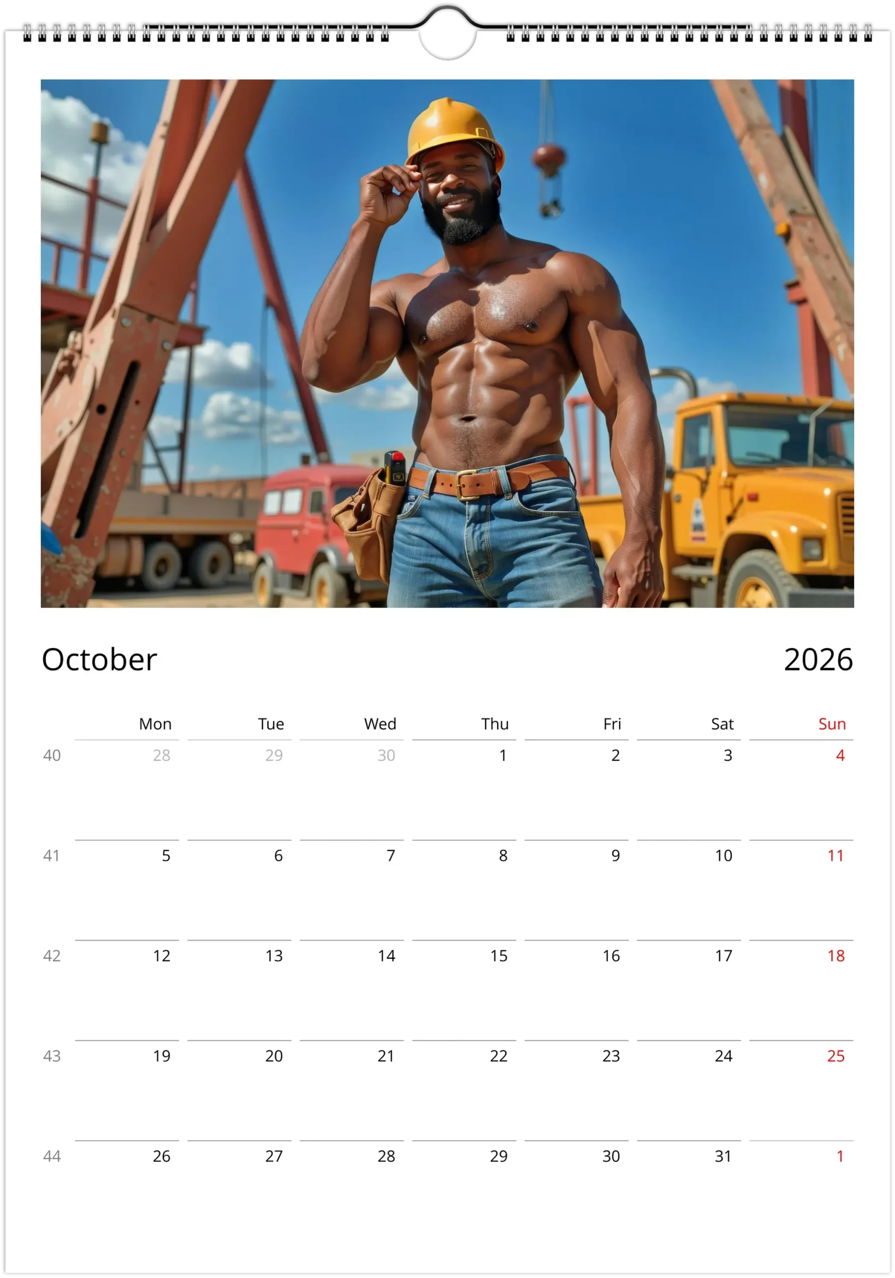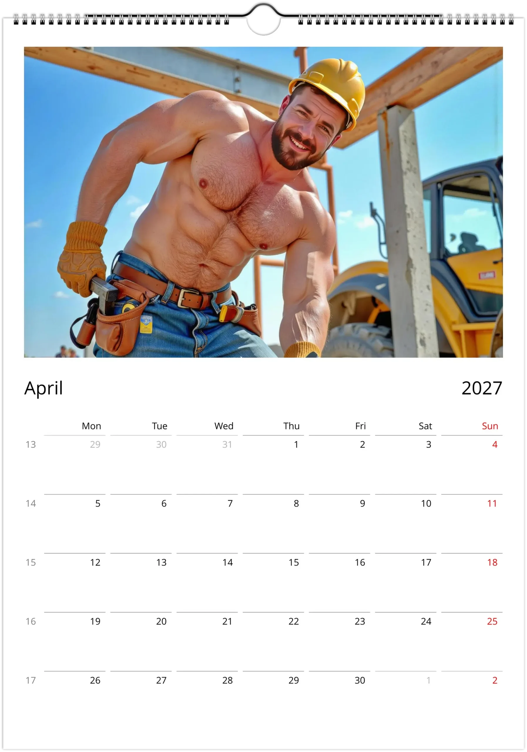This calendar leans into that visual language with bold, high-detail imagery that feels rugged, warm, and unapologetically playful. It is a clean, display-ready collectible for your wall, desk, studio, or workspace, and a fun gift for anyone who loves construction-worker aesthetics, male pin-up energy, and beautifully printed calendars.